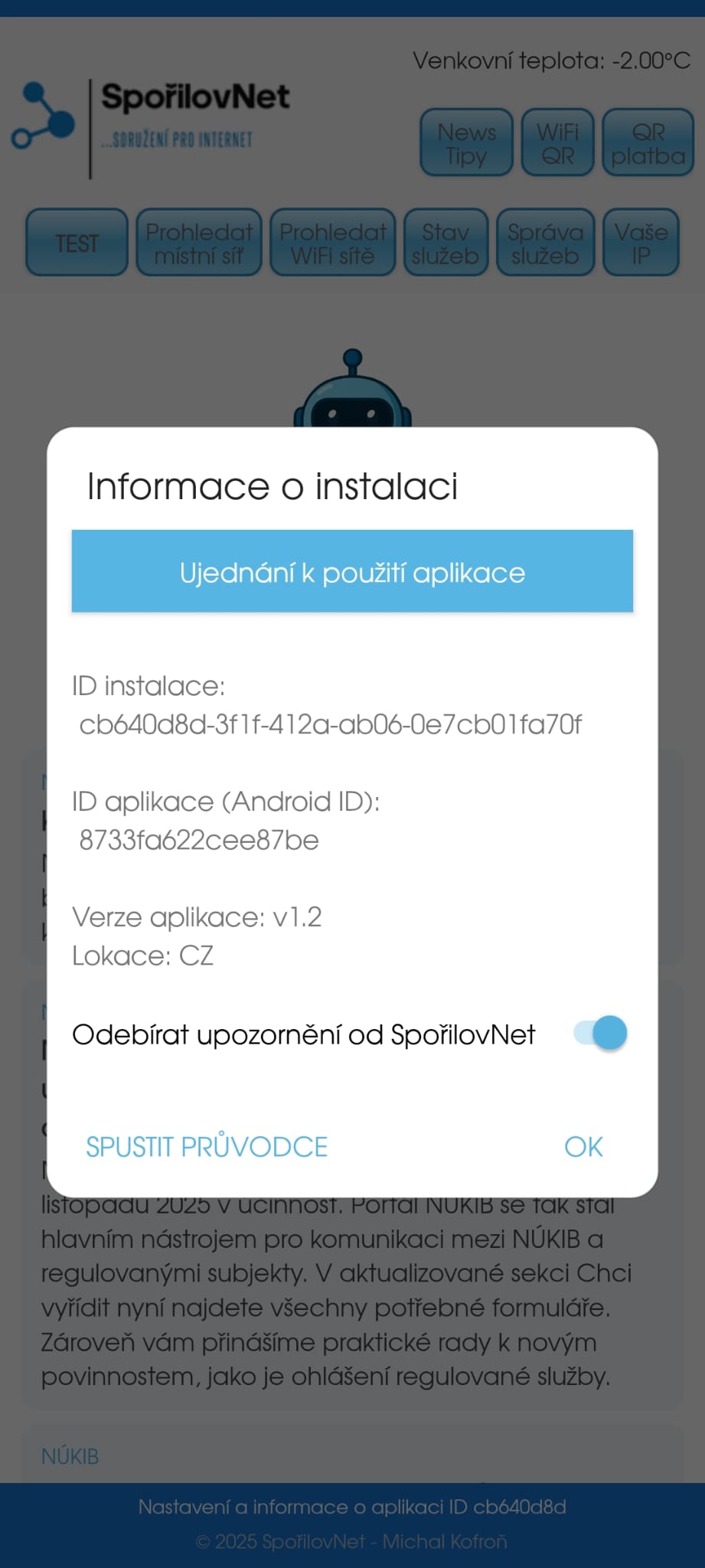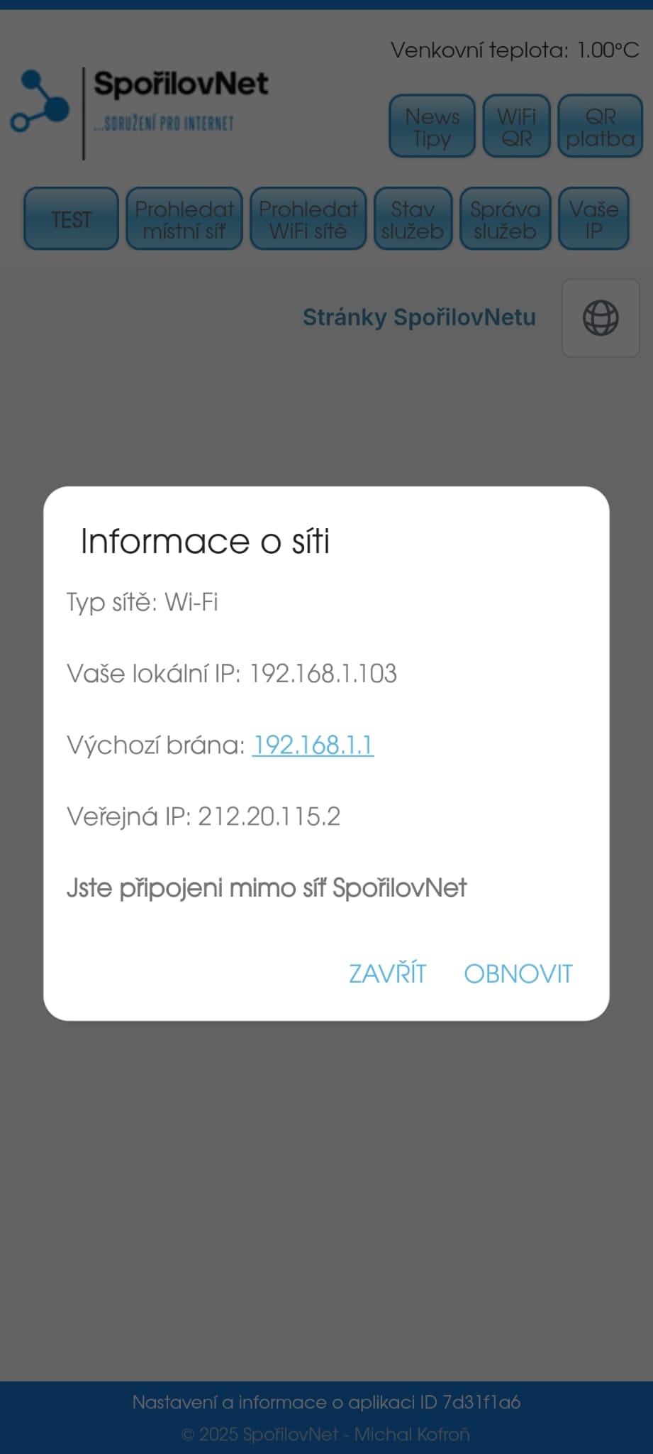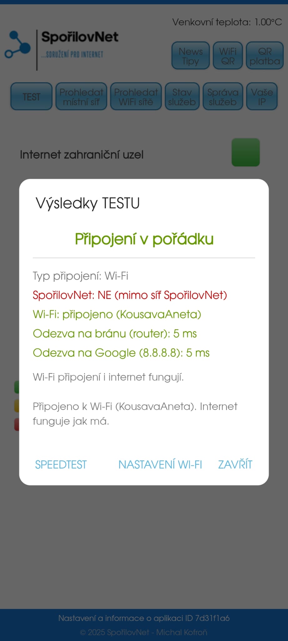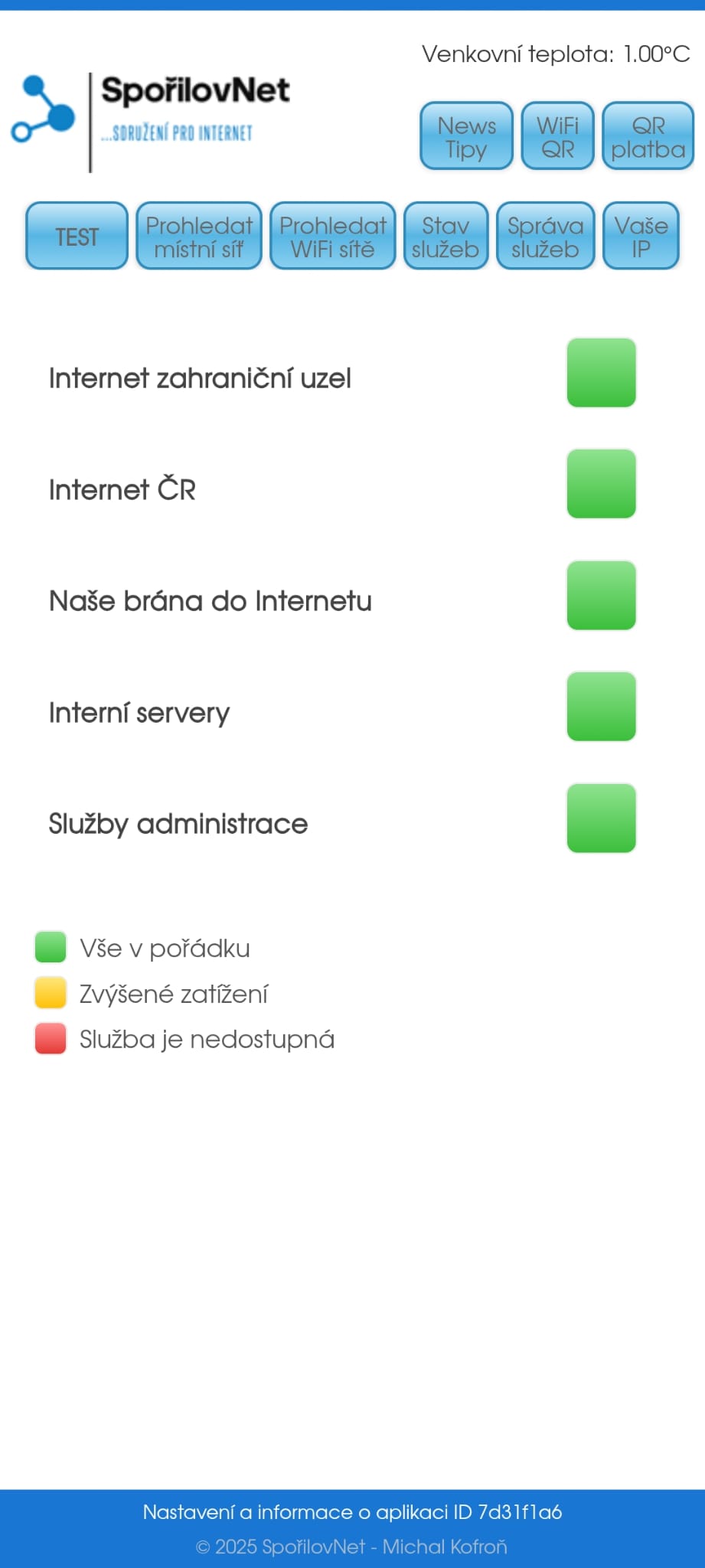 Připravili jsme pro Váš mobilní telefon Android aplikaci (zdarma ke stažení), která zvládne a pomůže s identifikací případného problému v lokálním připojení, srozumitelně popíše problém, což nám následně urychlí řešení. Dokáže zobrazit stav interní sítě, funkčnost služeb na serveru a internetu.