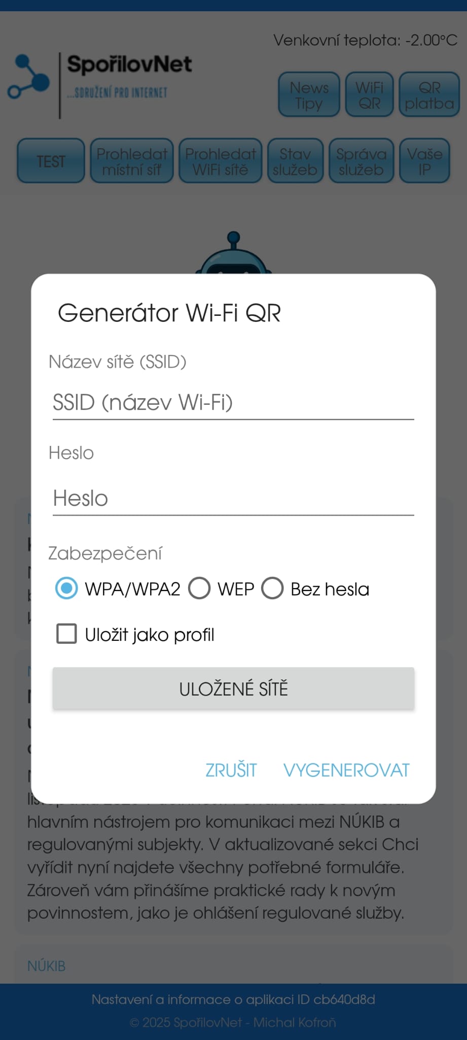 Aplikace Vám pomůže při sdílení vaší WiFi sítě, potřebujete-li údaje předat nebo si zapamatovat pro další členy, stačí si vygenerovat QR kód a ten sdílet nebo uložit jako profil v aplikaci pro budoucí použití. Vytvářet profily sítí a ty případně kdykoli použít nebo sdílet.